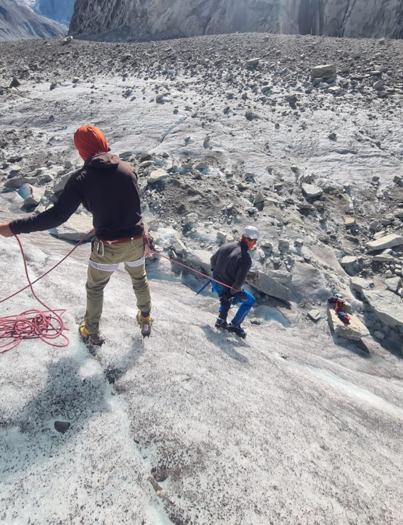 Les exercices pratiques incluent la marche en crampons sur différents terrains, les arrêts en cas de glissade, et les premières manipulations de corde.